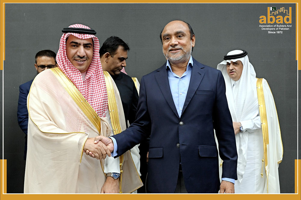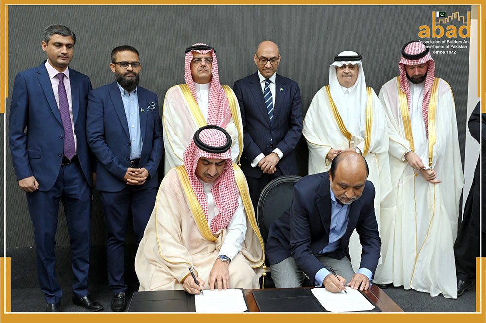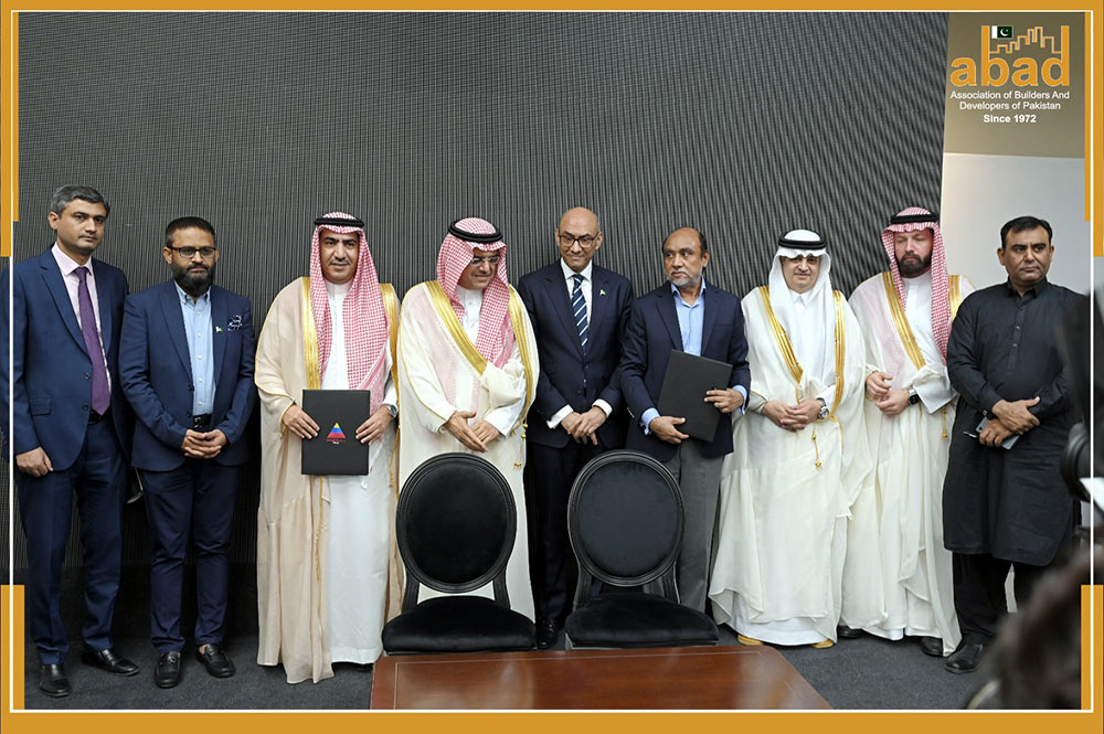 A Memorandum of Understanding (MoU) was signed between the Association of Builders and Developers of Pakistan (ABAD) and the Saudi Pakistan Business Council (SPBC) to enhance economic cooperation between Pakistan and Saudi Arabia. In the pictures, Senior Vice Chairman ABAD Syed Afzal Hameed and Vice Chairman SPBC Muhammad Abdulaziz Al-Jalaan are signing the MoU, while Vice Chairman ABAD Tariq Aziz and Chairman Southern Region Ahmed Owais Thanvi are also present on the occasion. The meeting was held under the leadership of Prince Mansoor bin Muhammad Al Saud.